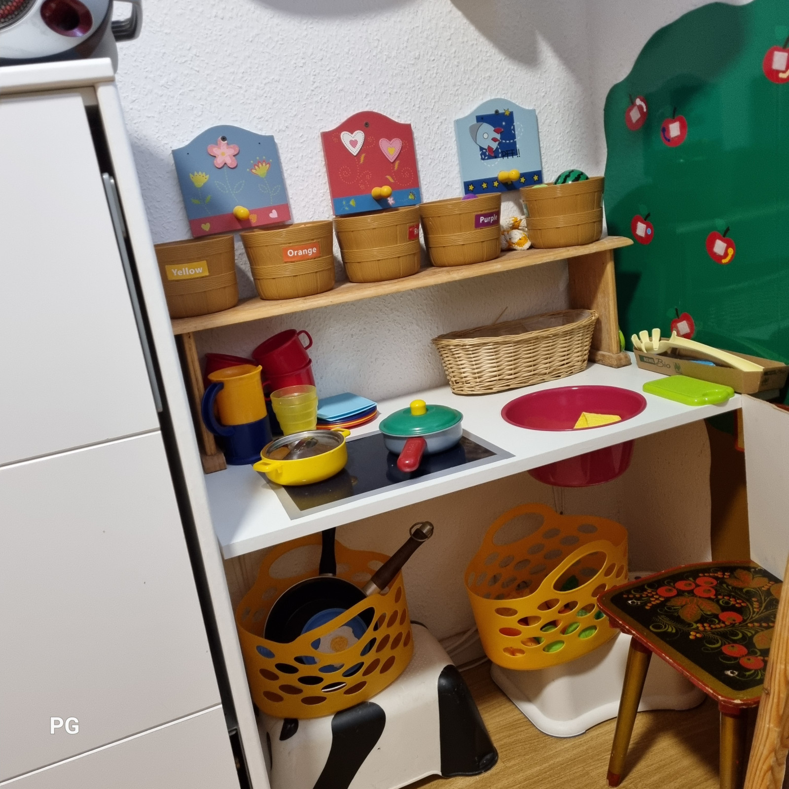 Oft experimentieren sie mit Instrumenten (eine Auswahl steht ihnen jeder Zeit selbstbedienend zur Verfügung) Schlaginstumente, Handpan, verschiedne Rasseln ... Wer nicht selbst musizieren will, tanzt oft mit den vielen bunten Tüchern.