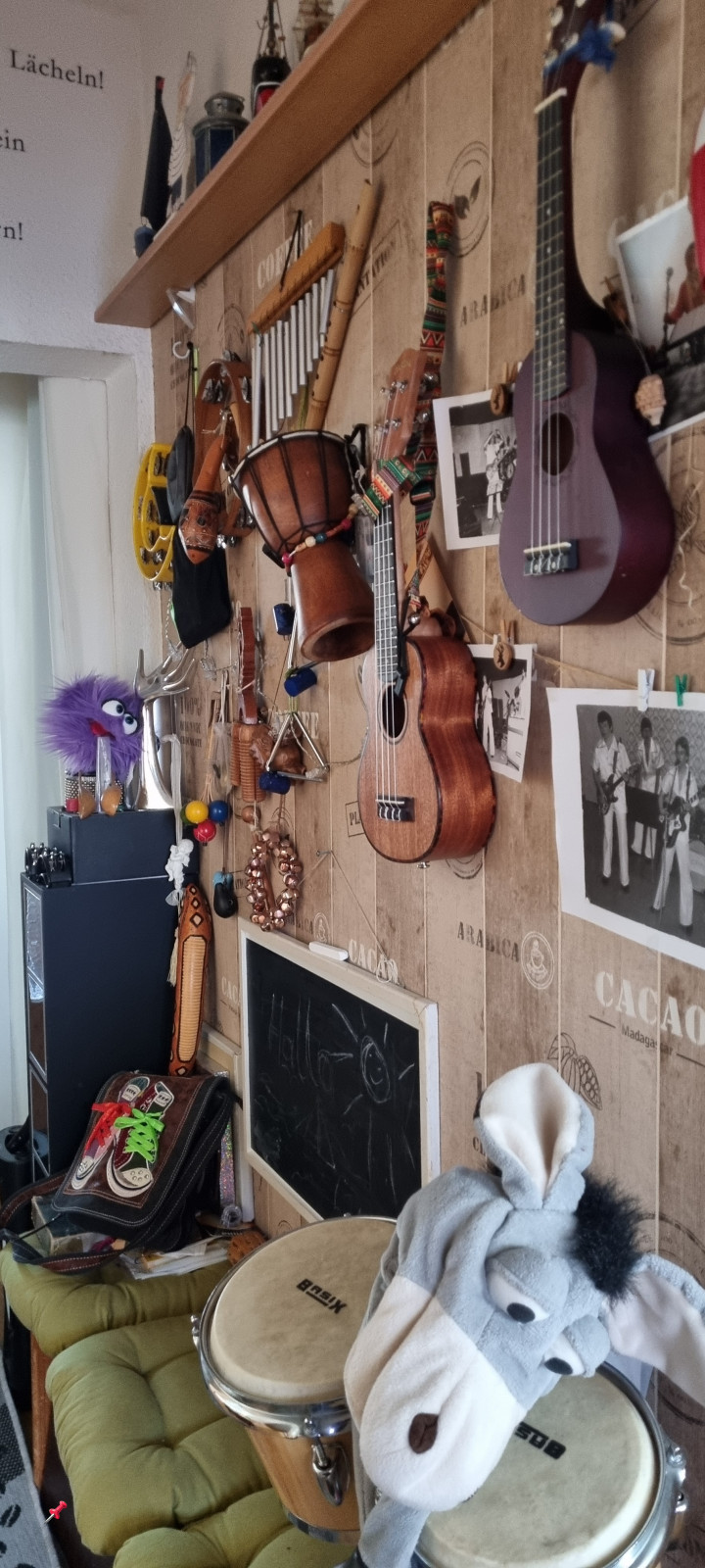 Auch Musik und Singen kommen hier nicht zu kurz. Ich besitze viele Instrumente und lasse die Kinder dran teilhaben. Es regt Geist und Wortschatz an, fördert Aussprache und macht viel Spaß.